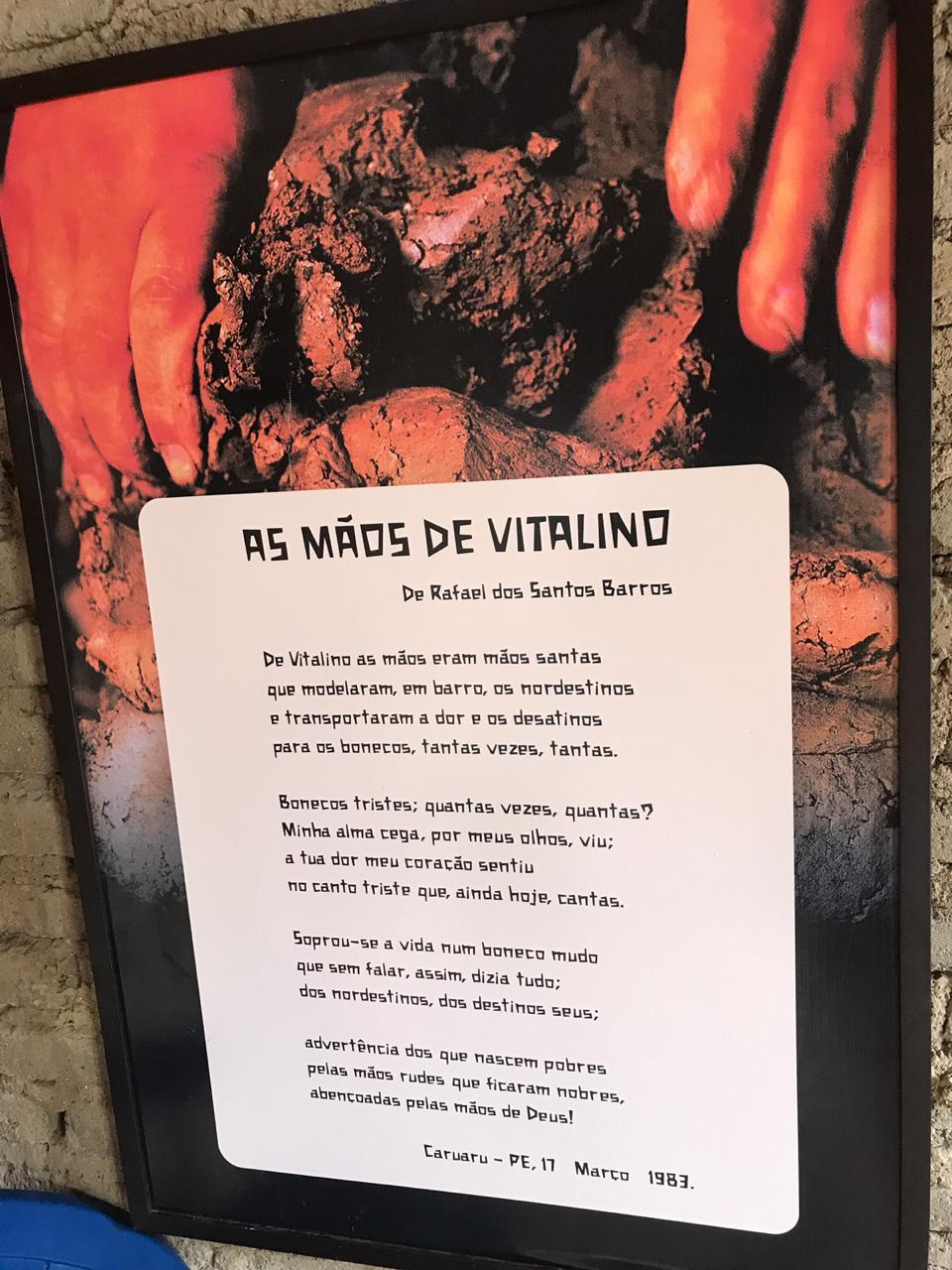 Consta numa das paredes do Museu, a íntegra do poema “AS MÃOS DE VITALINO”, de autoria de Rafael dos Santos Barros. Caruaru, 17 de março de 1983. Lembra os 20 anos da morte do artista. Leitura obrigatória.