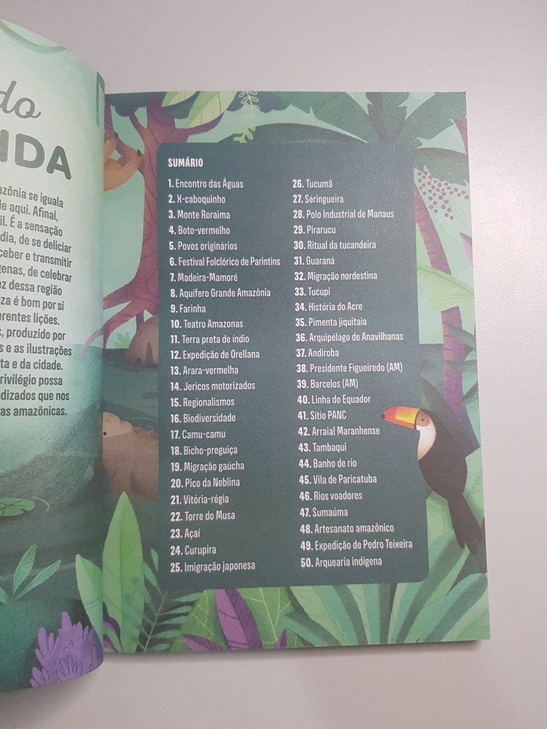 O livro consta com 50 curiosidades, e posso falar que é encantador. É uma leitura leve, divertida, e aprendemos mais sobre fatos históricos, a culinária, os pontos turísticos e muito mais. Vou compartilhar a curiosidade que eu achei poético: “Tudo está conectado. A sumaúma pode atingir até 50 metros de altura e 2 metros de diâmetro. Tão colossal que funciona até como ponto de referência na floresta. Essa imponência toda também se reflete nas raízes, chamada de sapopemas: gigantescas, elas se espalham por até 300 metros pela mata para equilibrar o peso da árvore. Quando se bate em uma sapopema, ela ecoa um som característico, e o estrondo cobre grandes distâncias, servindo para avisar sobre a presença de alguém e montar uma grande teia de comunicação em que tudo está conectado”.