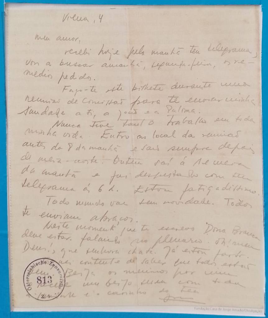 Amado foi casado com a escritora Zélia Gattai por 56 anos (1945 a 2001). Certa vez, longe de casa, “quando o escritor participava do Congresso da Paz, em Viena”, a saudade fê-lo palpitar mais forte seu coração por Zélia. Então, em 04 de novembro de 1951, enviou à sua amada esta carta de amor. Cuja íntegra é a seguinte: